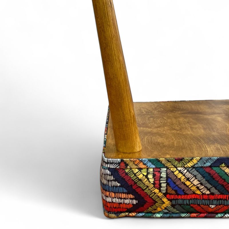 Ovaj tabure, sa dinamičnim dezenom u živopisnim bojama, savršeno spaja retro šarm i funkcionalnost.